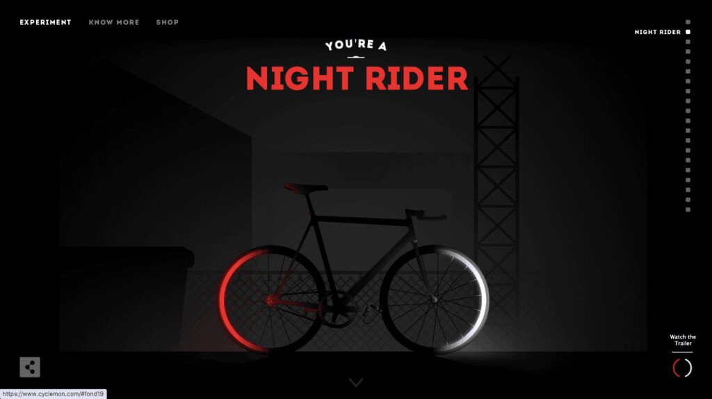 Cyclemon, một trang web bán xe đạp độc đáo với hình ảnh và thiết kế 3D cực kỳ tối giản nhưng cuốn hút. Người dùng có thể chọn các loại xe đạp khác nhau và xem chúng trong môi trường 3D.